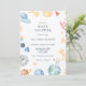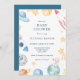 Convite para Chás de fraldas com tema espacial que inclui um astronauta de bebê a aquarelas e elementos espaciais, incluindo planetas, estrelas, um foguete e OVNI. Personalize com suas informações ou clique em "Clique para personalizar mais" para editar estilos de fonte, tamanho e cores.