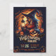 Convite com uma bela bruxa na floresta com uma lanterna e jack-o-lanternas.