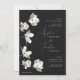 Estes elegantes convites para casamento de 5" x 7" apresentam flores de madeira de anão desenhadas à mão em rosa branco e poeirento pálido sobre um fundo preto num design formal com os marcadores, "Por favor juntem-se", nomes dos pais, "em celebração do casamento da filha deles", casal primeiro e sobrenomes, dia da semana, data, hora, local, endereço do local e "recepção a seguir".