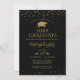 Convite elegante de festa de formatura preta e dourada, com boné de formatura falsa dourado ou mortarboard, minúsculo confetti e formando de script manual moderno contra uma cor de fundo editável que você pode mudar para uma cor de escola ou para uma cor favorita. ASSISTÊNCIA: para obter ajuda com a modificação ou personalização do design, alteração de cor, transferência do design para outro produto ou você gostaria de coordenar itens, entre em contato com o designer ANTES DE ENCOMENDAR através da guia MENSAGEM de bate-papo Zazzle ou envie um email para makeitaboutyoustore@gmail.com.