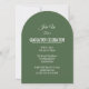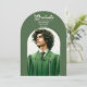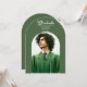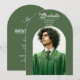 Um elegante e moderno cartão com fotos de graduação verde-azeitona para um jovem rapaz/estudante que se formou com cores voadoras. O design com arco apresenta uma cor vibrante de verde-oliva com tipografia branca. O texto em frente tem "Nome do estudante", "Nome da Escola" e "Ano da Classe". O texto no verso contém os detalhes da festa de formatura. O texto pode ser facilmente personalizado e a imagem pode ser substituída por sua foto em um quadro arquivado.