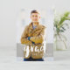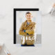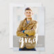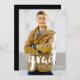 A tipografia moderna na moda é apresentada neste anúncio de graduação/convite que combina o estilo masculino com linhas limpas contemporâneas. O texto branco e o formando em negrito são colocados contra uma banda de cinzas transparentes, permitindo que o fundo da foto vertical do retrato do mais velho do seu filho apareça. No verso, todo o texto pode ser personalizado. Use como convite para uma festa de formatura (conforme mostrado) ou altere facilmente o texto para apenas um anúncio.
