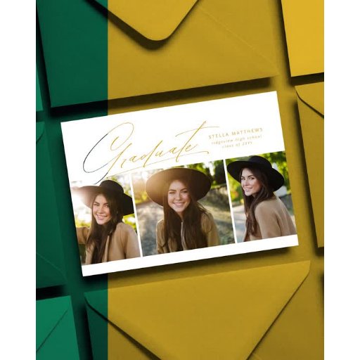 Este anúncio e convite para a graduação de três fotos é a forma perfeita de celebrar seu formando. Com um roteiro moderno e elegante "formando" a preto e sublinhado, esse design também oferece espaço para personalização, incluindo nome, escola e ano. A parte de trás é um na moda preto com um padrão traço sutil para corresponder ao sublinhado na parte frontal e inclui espaço para texto de convite para festa de formatura. Este anúncio de graduação de na moda funciona bem para um formando de segundo grau ou um formando universitário. Outras cores e estilos disponíveis na coleção por Lea Delaveris Design. Também disponível como download digital.