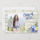 Fundo de conselho de madeira, russo, branco, com modelo fotográfico, "Classe de 2019", e buquê floral azul, roxo e amarelo no canto inferior direito. modelos convites de festas atrás com o mesmo fundo de madeira e flores.