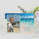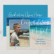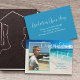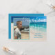 Anúncio de formatura com foto e texto personalizado. Adicione uma foto vertical na frente sobre uma imagem de fundo de praia tropical. Grande texto em itálico branco "Parabéns Nome". Adicione mais texto para o nome da escola e turma do ano. No verso, personalize para uma celebração com texto branco sobre cor azul mar. Altere e exclua o texto conforme necessário.