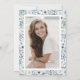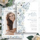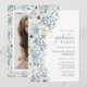 Convite de Formatura Blue Wildflower. Celebre sua formatura com estilo com este convite de festa elegante, perfeito para formandos do ensino médio e graduados universitários. Com belas flores de aquarela pintadas à mão, este design apresenta um delicado buquê lateral de rosas azuis empoeiradas, creme e brancas, acentuadas com folhagem de eucalipto verde suave e salvia para um toque rústico e refinado. A fonte azul-cinza atemporal adiciona um elemento sofisticado, tornando-a ideal para celebrações de formatura na primavera e no verão. O verso do convite inclui um padrão coordenado e um espaço dedicado para uma única foto querida, criando um souvenir pessoal e elegante. Se você está organizando uma reunião íntima ou uma grande celebração, este convite define o tom perfeito para um evento inesquecível.
