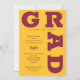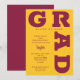 O texto 'GRAD' em letras maiúsculas e vinho curva-se em torno das bordas destes convites de festa de formatura com fundo amarelo dourado. Itens CORRESPONDENTES e mais cores em nossa coleção.