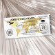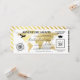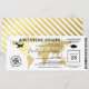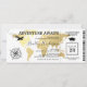 Convite de festa de formatura com cartão de embarque apresentando um elegante mapa mundial de destino em folha de ouro, bússola, avião, chapéu de graduado e um modelo de texto personalizado.