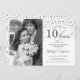 Convite de 10º Aniversário de Casamento com Foto. Design elegante em prata e branco com fonte manuscrita e confetes de diamantes. Pode ser personalizado para mostrar qualquer ano de casamento. Saúde por 10 anos!