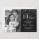 10º Convite de Aniversário de Casamento com Foto. Design elegante em prata e preto com letra de script e diamante confetti. Pode ser personalizado para mostrar qualquer ano de casamento. Saúde a 10 anos!