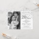 Convite de 20º Aniversário de Casamento com Foto. Design elegante em prata e branco com fonte de caligrafia e confetes de diamantes. Pode ser personalizado para mostrar qualquer ano de casamento. Saúde por 20 anos!