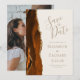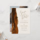 Este elegante e moderno salve a placa de data apresenta uma cor d'água laranja queimada e borda geode aparada com falso brilho dourado. O texto dourado aparece num fundo de marfim. Substitua facilmente a imagem de amostra no lado oposto por uma foto vertical da futura noiva e noiva.