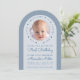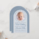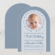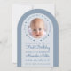 Um convite moderno para o primeiro aniversário de um menino. Em um fundo azul empoeirado, há um arco branco com uma foto circular e texto azul clássico dentro. Ao redor da foto, há o texto em arco "Nosso pequeno querido está fazendo um ano" com pequenos corações vermelhos entre as palavras. A ocasião Primeiro Aniversário e o nome são escritos em uma fonte manuscrita.