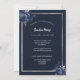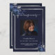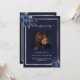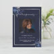 Um fundo azul escuro, um falso quadro prateado e flores azuis, flores. Personalize e adicione nome, datas e fotos e seu texto.