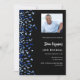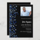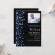 Um moderno, elegante e convite. Um fundo preto decorado com confete azul. Personalize e adicione fotos, um nome e detalhes da festa. Texto branco.