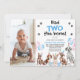 Foto Azul Mau Dois O segundo aniversário dos Cães Ósseos Convite para segundo aniversário de Cães Cutos, com vários cães, balões, chapéus de festa e ilustração óssea. Este dois maus do convite de aniversário de ossos também mostra algumas impressões de pata preta e sua foto de meninos do lado.