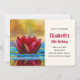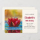 Convite de aniversário com uma fotografia de uma lagoa com uma adorável flor vermelha de lótus a vaguear por cima.
