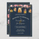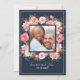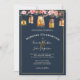 Esses convites românticos e chicos para casamento de fotos florais apresentam sua própria foto e uma combinação elegante de lanternas românticas com aquarelas e luzes de coral elegantes, ouro rosa, pincel, pêssego, e peônias cor-de-rosa e outras flores em um fundo azul marinho com armações de ouro e roteiro tendencioso com letra de mão. São perfeitos para o casamento floral, o rosa de ouro, o casamento rosa, o marinho azul, o casamento, o casamento de corais, o casamento pincel, o casamento cor-de-rosa pincelado, as luzes de casamento, o casamento romântico, o casamento de fazendas, o casamento elegante, as lanternas russas, o casamento romântico, o casamento de moda, ou qualquer outro local de casamento moderno. Fácil de personalizar com sua própria foto e informações, e a cor de fundo também é personalizável. Design de T.K. em frente.