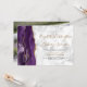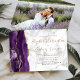 A borda esquerda deste elegante convite de casamento moderno apresenta uma cor d'água roxa, borda agitada, aparada com falso brilho dourado. O texto personalizável combina manuscrito preto e dourado, fontes em copperplate e itálico em uma cinza e fundo de mármore branco. Substitua facilmente a imagem de exemplo no verso por sua própria foto horizontal.