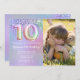 Foto 10º convite de aniversário, cor-de-rosa púrpura, pinga o décimo convite de aniversário para uma menina de 10 anos com escrevendo moderno de escrita e balões de folha divertida.