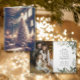 O cartão de Natal francês Chateau, estético, regencycore, com fotos da família, apresenta um quarto elegante e quente com janelas lindas e luz de velas. A magnífica árvore é alta com uma estrela brilhante no topo e uma abundância de presentes delicadamente embrulhados por baixo de seus arcos. Vintage desbotou e vestiu paleta colorida de cor azul francês esbranquiçada e dourada. Esta design foi gráfica desenhada por uma artista e designer internacionalmente licenciada, Audrey Jeanne Roberts, copyright. MSP0133