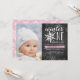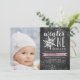 Brrr! Fotografias chicas congeladas para a maravilha do inverno as celebrações do primeiro aniversário exibem uma borda branca com flocos de neve em um fundo chalkboard rústico com sotaques cor-de-água rosados e gelados. "Winter ONEderland" aparece no topo em letras de escala branca, com um floco de neve posicionado para a letra "O". Personalize com seus primeiros detalhes de festa de aniversário, usando os campos de modelo, ao lado de uma foto favorita da aniversariante.