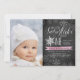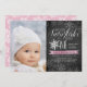 Brrr! Fotos de convites cheios de gelo para comemorações do primeiro aniversário de inverno apresentam uma borda branca com flocos de neve em um fundo chalkboard rústico com sotaques cor-de-água rosados e gelados. "Nosso floco de neve está girando um" aparece no topo em letras de escrita de caligrafia branca, com um floco de neve posicionado para a letra "O". Personalize com seus primeiros detalhes de festa de aniversário, usando os campos de modelo, ao lado de uma foto favorita da aniversariante.