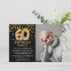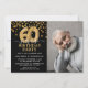 Convite de aniversário moderno de preto e ouro para alguém que está fazendo 60 anos! Apresentando um fundo preto, uma fotografia do aniversariante homem/mulher, falso confetti dourado, balões de 60 anos de ouro e um elegante modelo de aniversário que é fácil de personalizar.