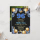 Um design moderno e elegante com o número 96 em azul com bordas douradas e balões com brilho prateado, azul e dourado e uma foto especial da pessoa aniversariante no verso do convite. Personalize os detalhes para uma Celebração de Aniversário única e sofisticada.
