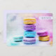 Convite de aniversário com uma fotografia deliciosa com uma pilha de macarões coloridos.