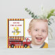 O convite para fotos da aniversário de 3 anos do festival de um caminhão de bombeiros vermelho e amarelo. O texto diz, "Soe o alarme, O NOME DA CRIANÇA está girando 3." O texto é totalmente personalizável para que este convite possa ser projetado para uma criança de qualquer idade.