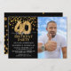 Convite de aniversário moderno de preto e ouro para alguém que está fazendo 40 anos! Apresentando um fundo preto, uma fotografia do aniversariante homem/mulher, falso confete de ouro, balões de aniversário de 40 anos de ouro e um elegante modelo de aniversário que é fácil de personalizar.