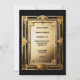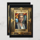 Uma elegante imagem de ouro ousada parece brilhar e brilhar contra um fundo preto que tem um modelo fotográfico para uma fotografia do seu funcionário ou executivo. A parte traseira tem a mesma borda retrógrada do ouro com modelos pretos em negrito que podem ser personalizados para atender às suas necessidades. Este design é adequado para um café da manhã de despedida, almoço ou janto ou uma festa de aposentadoria.