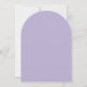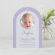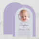 Um convite de batismo moderno e neutro em termos de gênero. Dentro de um arco lavanda (roxo claro), há um arco quase branco com uma foto placeholder redonda e texto roxo (mais escuro) dentro. Acima da foto, há uma cruz lavanda. A ocasião e o nome são escritos em um script de letra manuscrita.