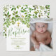 Convites de batismo/ batizado neutros em termos de gênero com um fundo branco clássico que pode ser alterado para qualquer cor, ramos de árvores em aquarela com folhagem verde exuberante, uma cruz dourada religiosa, uma foto de seu filho e um modelo de texto moderno que é fácil de personalizar.