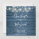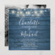 Com luzes de cordas, nomes elegantes de estilo de assinatura em um fundo azul de madeira rústica, juntamente com sua foto escolhida no verso, este convite de casamento de na moda pode ser personalizado com os detalhes de suas celebrações de casamento. Projetado por Thisnotme©