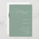 Este elegante convite para o casamento apresenta uma design refinada com um texto romântico em forma de arco que inclui as palavras "Casamento de" elegantemente escritas no topo, acrescentando um toque formal e eterno num fundo verde sábio. Aliado à tipografia serif limpa e a uma escrita manual moderna, esse convite minimalista é perfeito para casais que buscam um equilíbrio entre sofisticação e simplicidade. O design também inclui espaço para uma foto do casal e um código QR na parte traseira para opções de RSVP sem problemas. Tente se tornar ecológico com este convite moderno, tudo em um, ecológico, reduzindo o RSVP adicional e os cartões de detalhes. Basta adicionar seu próprio código QR à parte traseira do convite para seus convidados para RSVP e descobrir mais informações sobre seu casamento. Personalize os nomes e o texto em apenas alguns passos fáceis e personalize o cartão de convite com sua foto do casal feliz para lhe dar um toque exclusivo e pessoal. Por favor, note: o texto geométrico circular de "Por favor, junte-se a nós para o" juntamente com a elegante e bela tipografia de "Casamento de" na frente do convite E a menção "gentilmente responda por" no verso do convite juntamente com outros elementos gráficos trabalho de arte, como as linhas, não podem ser editadas, alteradas, movidas ou eliminadas. Eles estão consertados. Se precisar alterar a cor, você pode personalizar o cartão de convite. Você pode personalizar facilmente este convite com seu próprio texto e compartilhá-lo digitalmente através de texto, email ou mídia social. Como alternativa, você pode enviar uma versão impressa para seus convidados ou fazer ambos — enviar uma versão digital e acompanhar uma cópia impressa para obter uma experiência mais personalizada.