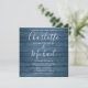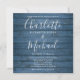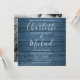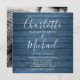 Apresentando nomes elegantes de estilo de assinatura em um fundo azul de madeira rústica, juntamente com sua foto escolhida no verso, este convite de casamento de na moda pode ser personalizado com seus detalhes de celebração de casamento. Projetado por Thisnotme©