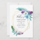 Turquesa e folhas tropicais de cor d'água roxa, convite para casamento com moldura geométrica dourada e tipografia elegante. A foto no verso é opcional. Se você a remover, role para baixo até a parte inferior de "Personalizar este modelo" e clique em "Editar usando a ferramenta Design". Na Ferramenta Design, você pode editar, dimensionar, excluir ou mover qualquer texto ou design elementos desejados.