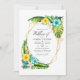 Turquesa exótica e convite floral para o casamento na praia de verão, amarelo, com abundantes verdes tropicais em uma estrutura geométrica de ouro personalizável para suas especificidades de evento. A foto no verso é opcional. Se você a remover, role para baixo até a parte inferior de "Personalizar este modelo" e clique em "Editar usando a ferramenta Design". Na Ferramenta Design, você pode editar, dimensionar, excluir ou mover qualquer texto ou design elementos desejados.