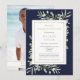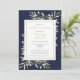 Um convite de lembrança de celebração de vida personalizado e elegante, apresentando folhagem verde de aquarela botânica em um fundo azul-marinho. Criado por Thisisnotme©