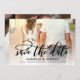 Este na moda para salvar os recursos do cartão de anúncio de data mostra sua foto, emparelhando-a com um script de caligrafia moderna e romântico que diz "Salve a data". Basta adicionar sua foto à parte frontal e traseira e preencher os detalhes de seu grande dia usando os modelos fornecidos.