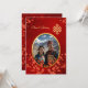 Esta versão não tem nenhum título de convite da família. Este elegante convite para o casamento mostra uma foto redonda cercada por galhos florescentes de cereja vermelha e um nó sem fim ouro num fundo vermelho brilhante. Nomes de noiva e noiva em um roteiro clássico elegante.