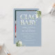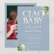 Convite de chuveiro de bebê ciao com tipografia elegante e bonita de folhagem botânica em um fundo azul empoeirado e sua foto especial no verso. Projetado por Thisisnotme©