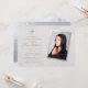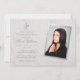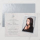 Um convite moderno para um evento religioso. O texto está na metade esquerda. A foto está inclinada, na metade direita, em uma moldura de folha de prata falsa. O fundo é mármore branco. Acima do texto há uma cruz de prata falsa. O texto é cinza prateado. O nome está escrito em uma fonte caligráfica elegante. A parte de trás é folha de prata falsa.