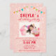 Convite Fotográfico de Festa de aniversário Cinzenta Rosa Brilhante. Convite de aniversário bonito e divertido para uma garota. O design tem lindas bandeiras coloridas de bunting em um fundo brilhante rosa. Personalize todo o texto do convite e insira sua foto no modelo. Este design alegre pode ser usado por várias idades.