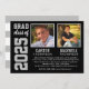 Anuncie seus formandos de segundo grau em estilo com este anúncio de graduação e convite de festas. O cartão de dois lados foi projetado para dois formandos e apresenta suas fotos com um design simples e masculino com uma letra inspirada em camisa esportiva. As cinzas pretas, prateadas e brancas podem ser personalizadas para corresponder às cores da sua escola. Um padrão de listras brancas se veste na parte de trás do cartão. *Dica de Foto: recorte suas fotos em forma quadrada antes de carregá-las.