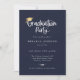 Script branco reproduzível com sotaque de boné de formatura ouro, convite de festa de formatura. Recursos, fundo de cor azul do marinho e foto do solteiro na parte traseira.