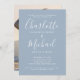 Apresentando nomes de estilo de assinatura, este elegante e moderno convite de festa de noivado simples pode ser personalizado com suas informações em letras brancas chic em um fundo azul empoeirado e sua foto especial no verso. Projetado por Thisnotme©