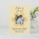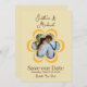 Este Save the Date personalizado para o anúncio do casamento apresenta um tema retrô, inspirado nos anos 70. O fundo é uma cor amarela suave, com texto marrom e os nomes do casal impressos em uma fonte de letra elegante. Uma flor laranja em estilo dos anos 70 é impressa no centro. Uma foto de amostra é colocada dentro da moldura da flor que pode ser personalizada para incluir sua própria foto personalizada ou outra imagem.